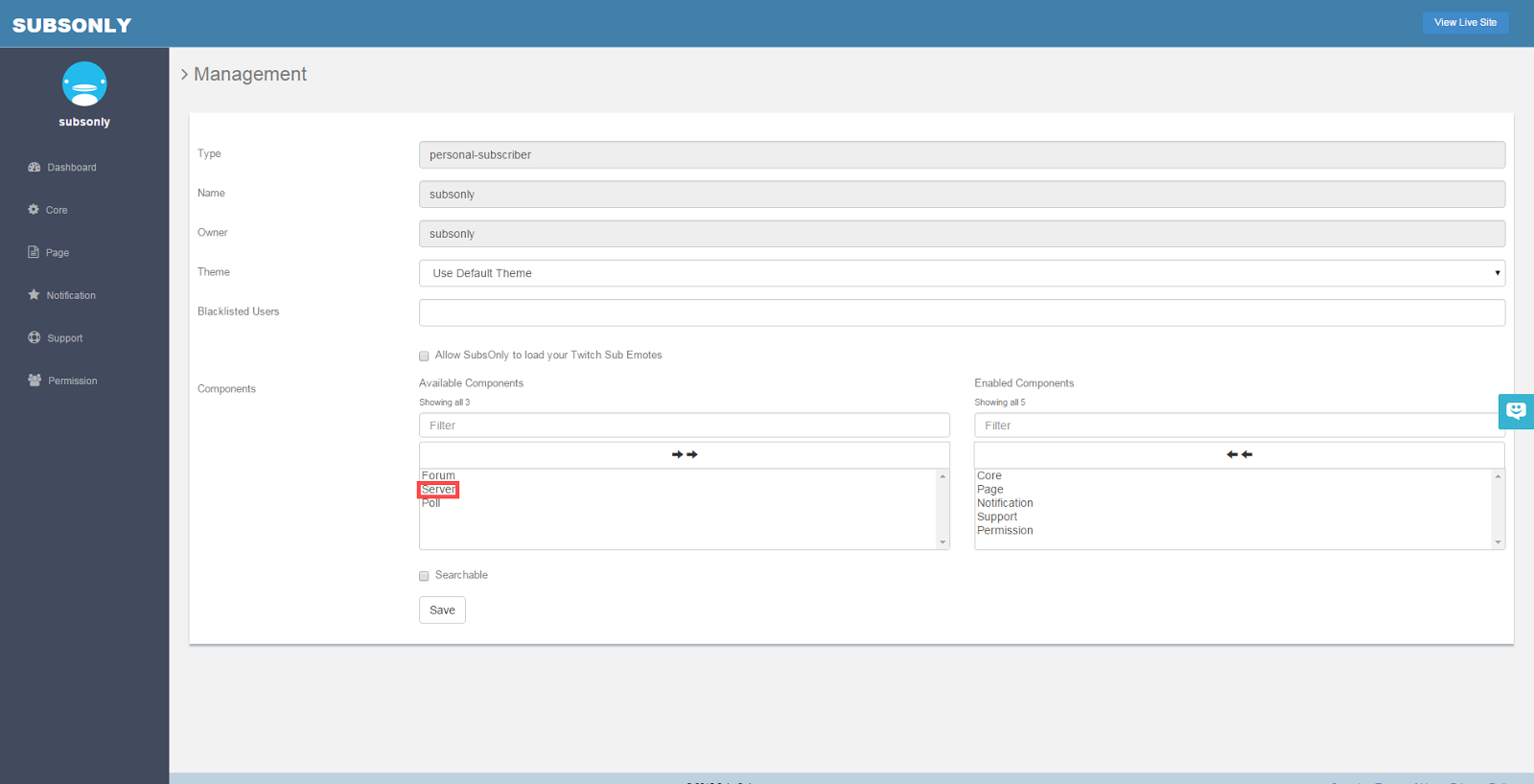 On the Core page is where you choose which features you would like to have on your site. On the left are available features and on the right are features that are already integrated. To add a feature, simply click it from the left side and it will move to the right side.